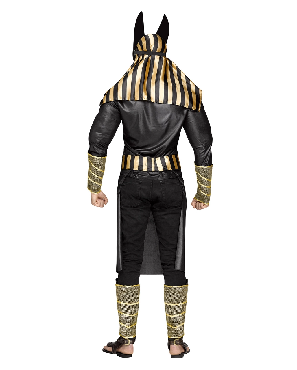 Das Anubis Herrenkostüm besteht aus sieben Teilen. Ein Shirt mit Polsterungen für beeindruckende Muskeln ist in Schwarz gehalten. Am schwarz-golden gestreiften Gürtel mit stilisiertem Ankh als Schnalle ist ein schwarzer, hinten offener Rock angebracht, was den altägyptischen Look betont. Das Halsteil der Anubis Schakal Verkleidung wird unkompliziert mittels zweier Bänder befestigt und setzt dank der türkis eingefärbten Felder gekonnt Akzente zur edlen schwarz-goldenen Optik. Die Arm- und Beinüberzieher werden mit Klettverschluss an Armen bzw. Beinen befestigt und zieren durch ihre glänzende goldene Färbung das Gottheit Kostüm zusätzlich. Die Halbmaske zeigt die charakteristische Schakal-Form und wird mit einem elastischen Zugband am Hinterkopf befestigt. Um dieses geschickt zu verdecken, kann der für Pharaonen typische Kopfschmuck ebenfalls mit einem elastischen Zugband am Kopf angebracht werden. Dazu passen das Pharaonenzepter mit Schlange und ein Ägyptischer Schlangenarmreif gold.