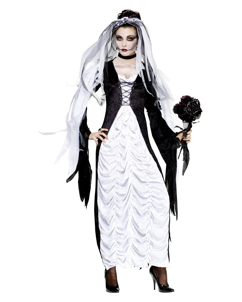 Die Braut der Finsternis ist bekannt dafür, dass keiner ihrer Ehegatten länger als ein paar Monate zu leben hat! Unschuldig an ihr der schwarzen Witwe ist nur der weiße geraffte Rock! Das Braut der Finsternis Kostüm besticht durch seine wunderbare, edle Optik. Das bodenlange Hochzeitskleid ist aus schwarzem Samt mit weißem gerafften Satin auf der Vorderseite, schwarzen Fransenärmeln, Gaze-Schleier und Halsband.
