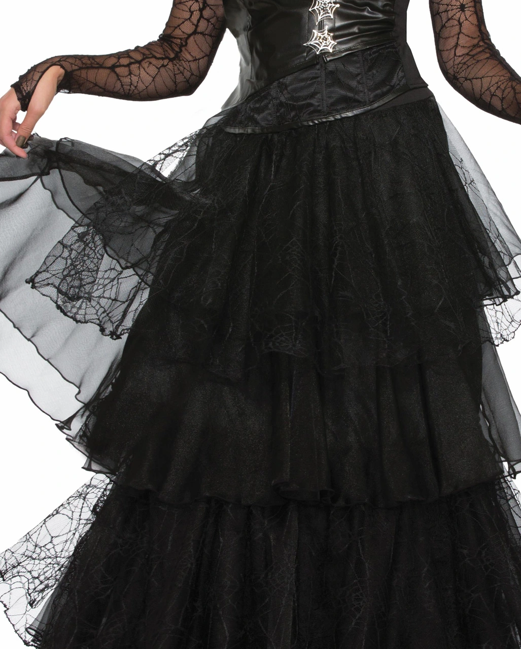Das Ember Witch Hexenkostüm ist ein Traum aus schwarzem Tüll. Das figurbetonte Hexenkostüm besteht aus einem Oberteil in Korsagen-Optik. Es hat keine Ärmel und zeigt somit viel Haut. Der Rock besteht aus Tüll, wobei einige Lagen mit einem filigranen Spinnweben-Design gestaltet sind. Das Material ist leicht dehnbar und sehr bequem. Du bekommst das Walpurgisnacht Kostüm in Größe 36/38 und 40/42. Hierzu passt die Juwelen Spinnenhexe Perücke