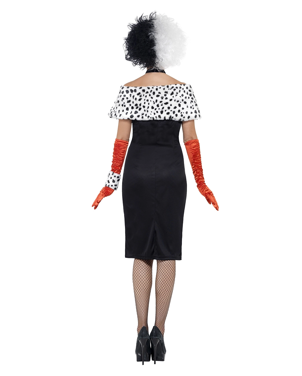 Das Evil Madame Kostüm besteht aus einem schwarzen Röhrenkleid das bis zum Oberschenkel geschnitten ist. Um bequem in dem sexy Kleid laufen zu können wurde am hinterem Rockteil ein Gehschlitz eingebracht. Zu dem trägerlosen Kleid gehören ein Paar rote glänzende Satinhandschuhe, die bis über den Ellebogen gezogen werden. Der zum Hexenkostüm gehörige Bolero und die Handgelenkstulpe sind aus Plüsch und in schwarz weiß gehalten. Die passende Kopfbedeckung zum Kostüm der Dalmatinerhexen wäre zum Beispiel die Frankenstein Monsterbraut Perücke schwarz / weiß.