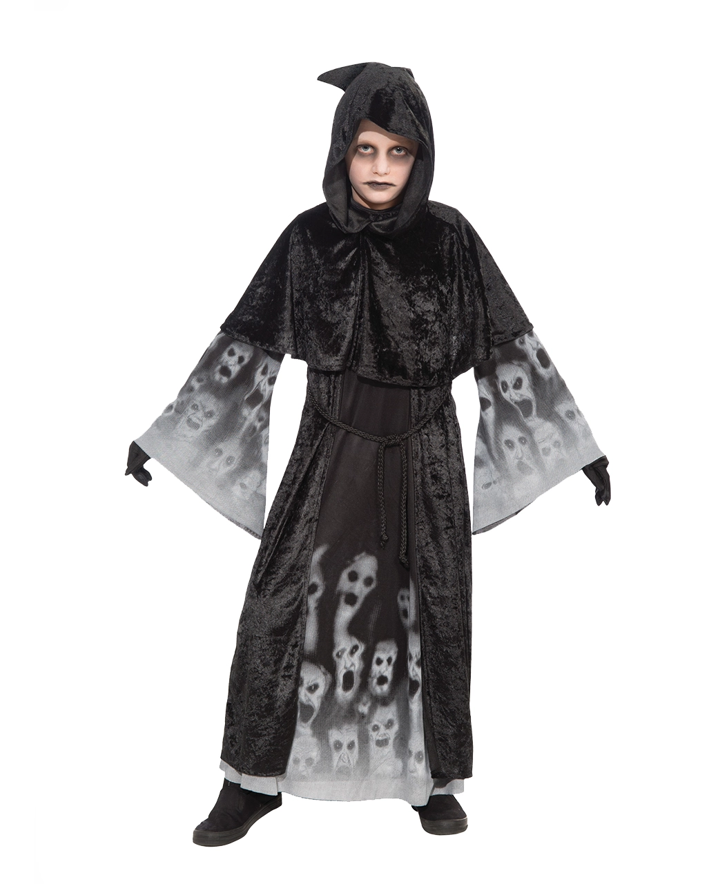 Happy Gruselnacht! Im Forgotten Souls Kinderkostüm habt ihr das Outfit eines unheimlichen Seelenfängers, der ein Profi im Herumspuken ist. Und das Beste an diesem Halloween Kinderkostüm: Du musst nicht frieren. Darunter kann man schließlich noch Strumpfhose, Leggings oder Hose und Pullover anziehen. Der Umhang mit dem Kapuzen Cape in tiefem Schwarz verbirgt alles. Zu Erkennen sind nur die verzweifelten Gesicher der gepeinigten Seelen, die an den weiten Ärmeln und in Hähe der Beine zu sehen sind. Schminkt euch passend dazu mit dem Spooky Ghost Make-up Set.