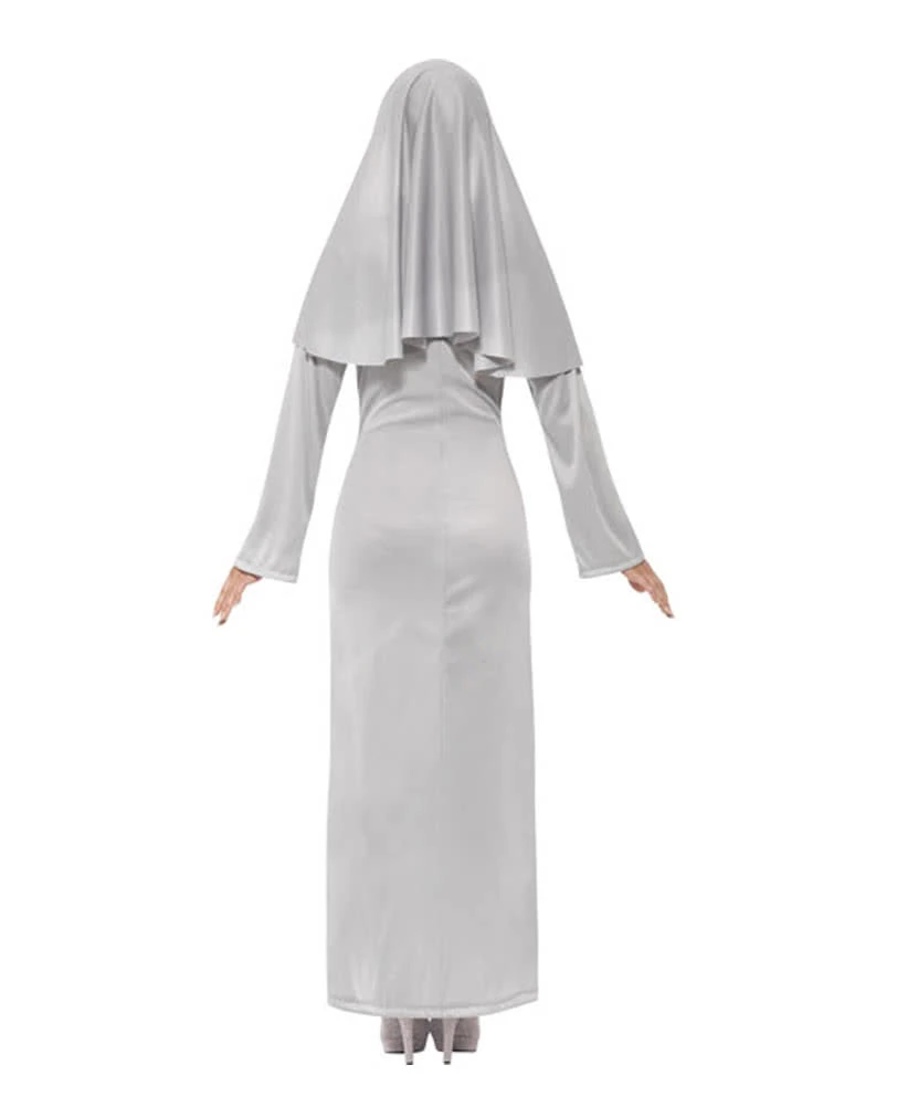 Das coole Gothic Nonnen Kostüm ist zweiteilig und enthält neben der Nonnenrobe auch die passende Kopfbedeckung. Das Langarmkleid ist aus angenehm weichem Stoff und ist in geisterhaftem hellgrau gehalten. Die leichten Trompetenärmel, der taillierte Schnitt und die graue Spitze am Dekolletée machen aus einem öden Nonnenkostüm ein heißes Klosteroutfit. Durch den schwarzen Rosenkranz mit Filzkreuz wird dem Nonnenkostüm ein bisschen Kontrast gegeben, ebenso wie durch den schwarzen Kragen. Dieser wird im Nacken mit einem Klettverschluss geschlossen, ebenso der Stoff am oberen Rücken. Die im Gothic Nonnen Kostüm enthaltene Schwestern Haube wird wie ein Haarband getragen und der Schleier fällt locker darüber. Um das Gothic Outfit komplett zu machen, empfehlen wir noch das passende Gothic Make up Set.