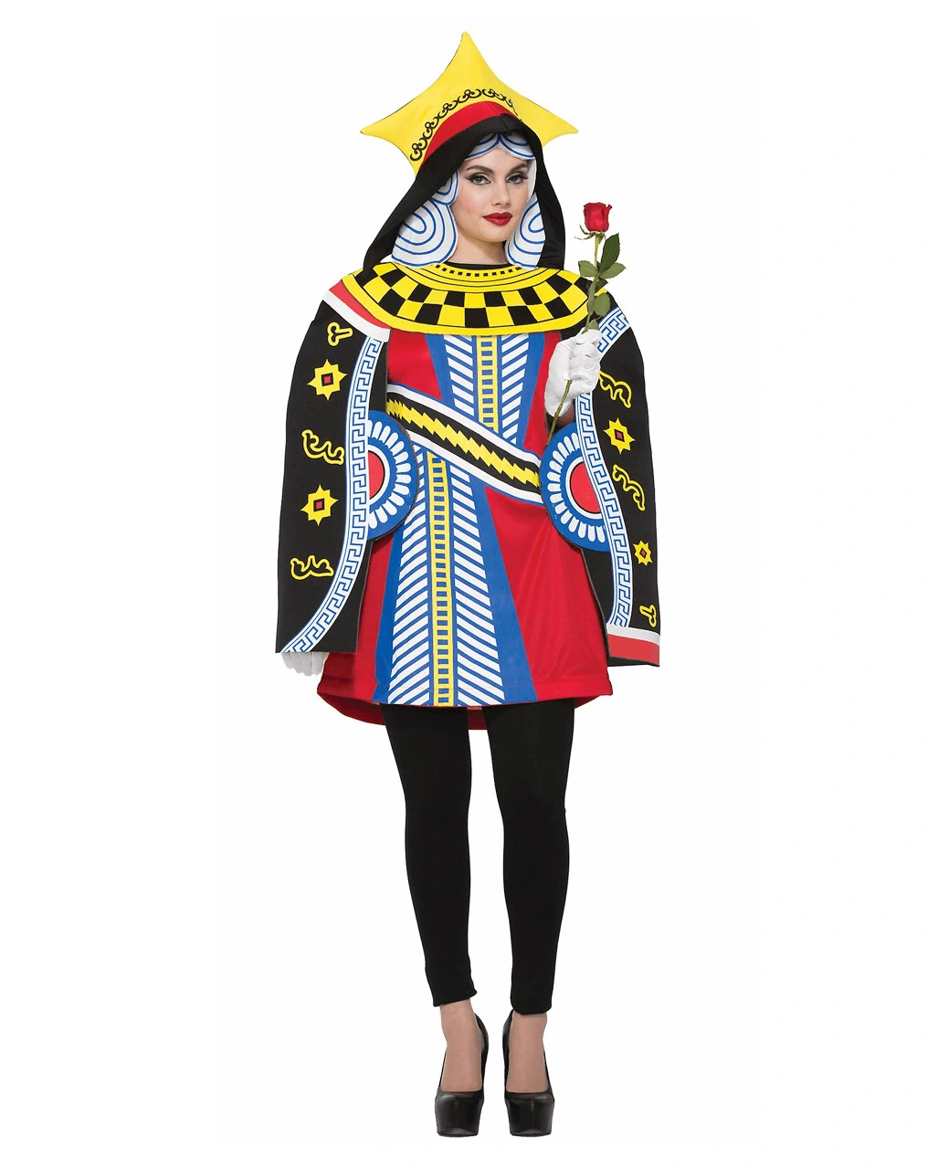 Das Herzkönigin Kartenspiel Kostüm besteht aus einem Kleid, einem Umhang und einem Kopfteil. Bunte Motive und Muster zieren dein farbenfrohes Kostüm und machen ordentlich Eindruck. Das Herzkönigin Kartenspiel Kostüm ist in M/L Größe verfügbar und besteht aus angenehm weichem Material. Trage den Look der eleganten Karten-Lady und entscheide die nächste Halloween-Party für dich! Hierzu passt unser Herzkönig Kartenspiel Kostüm