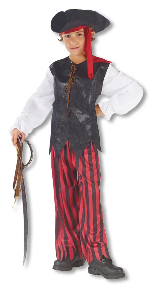 Alle kleinen Seeräuber die sich gern in die wilde Welt der Freibeuter träumen, haben mit dem Karibik Pirat Kinderkostüm die passende Piraten Verkleidung. Das tolle Piraten Kinderkostüm alles was so ein rauer Seebär braucht. Eine rot und weiß gestreifte Hose mit fransigen Beinen, das Oberteil mit weißen Hemdärmel und einer schwarzen Weste im Antikleder Look gehören zum Karibik Pirat Kinderkostüm dazu wie auch der schwarze Piratenhut mit angehähtem roten Bandana.
