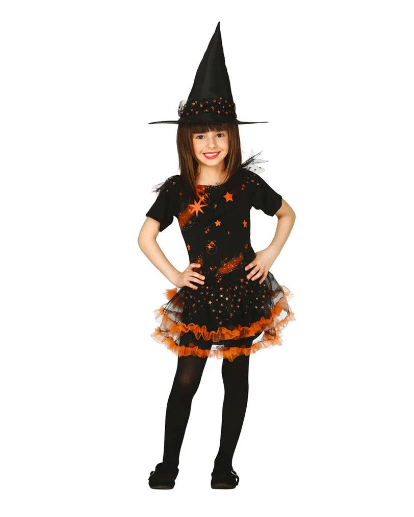 Das Kleine Hexe Estrella Kinderkostüm ist zweiteilig und besteht aus einem schwarzen Hut mit einer Tüllbordüre mit orangen Glitzersternen, die erst noch über die Hutspitze gestülpt werden muss, und einem zauberhaften Kleid. Das zauberhafte Kleid ist schwarz und hat kurze Ärmel. Das Oberteil ist mit großen und kleinen Sternen in orange bedruckt. Der süße und schön schwingende Tüllrock ist schwarz und hat eine orange Tüllbordüre. Darüber liegen, wie an den Ärmeln, schwarze Tüllspitzen mit orangen Glitzersternen. Für den Partnerlook mit der Mama empfehlen wir das Spiderella Kostüm.