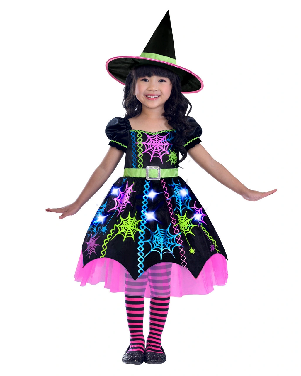 Das Neon Spinnenhexe Kleinkinderkostüm ist ein super niedliches Kinderkostüm für den ersten Trick or Treat oder die erste Halloween Party. Als hübsche kleine Magierin wird eure Süße zum bezaubernden Mittelpunkt des Geschehens. Keine Frage, dass hier Magie im Spiel sein muss. Oder wie kommt es, dass plötzlich alles nach der Pfeifer eurer kleinen Nachwuchs-Hexe tanzt. Alles nur Zauberei oder liegt es doch am mega coolen Kostüm? Auch beim Kinderfasching und auf dem Kindergeburtstag mit Märchen Motto ist die Hexen Verkleidung für Mädchen ein kunterbunter Blickfang.