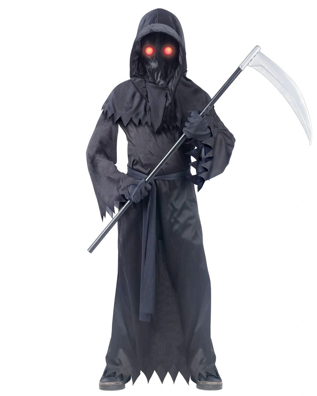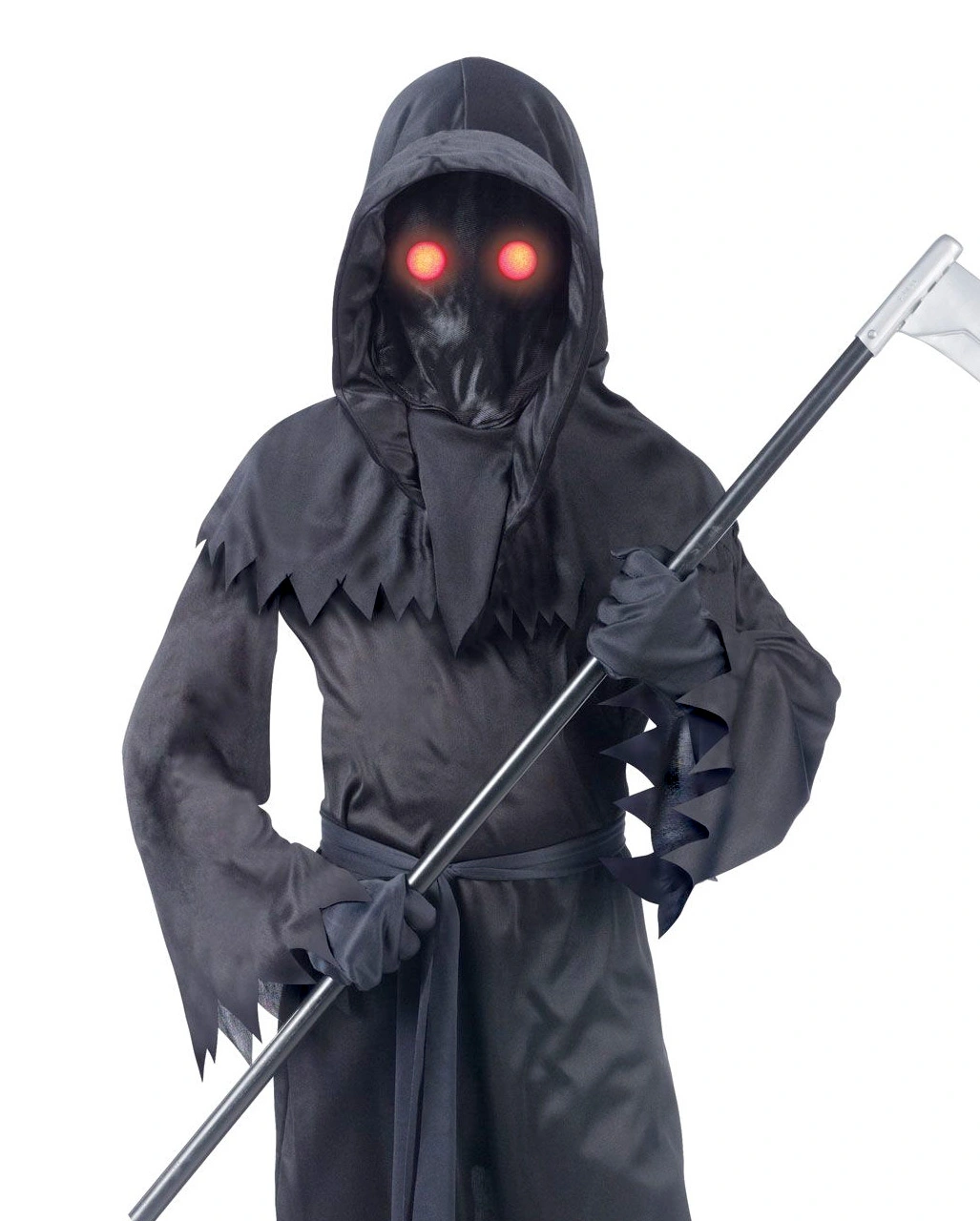 Mit dem Phantom Kinderkostüm mit leuchtenden Augen sorgst du für Angst und Schrecken. Du wolltest deinen Nachbarn schon immer mal das Fürchten lehren? Mit unserem schaurigen Geisterphantom Halloween Kostüm dürfte das kein Problem sein. Als schwarzer Sensenmann ziehst du an Halloween um die Häuser. Die anderen Trick or Treat Kostüme sind was für Weicheier. Mit dem schwarzen Kinderkostüm mit Leuchtaugen wirst du die meisten Süßigkeiten abstauben. Warum? Weil alle Nachbarn wollen, dass du schnell wieder gehst. Sie können deinen gruseligen Anblick nicht ertragen und werden dir die Tasche voller Schokolade packen. Hahaha!