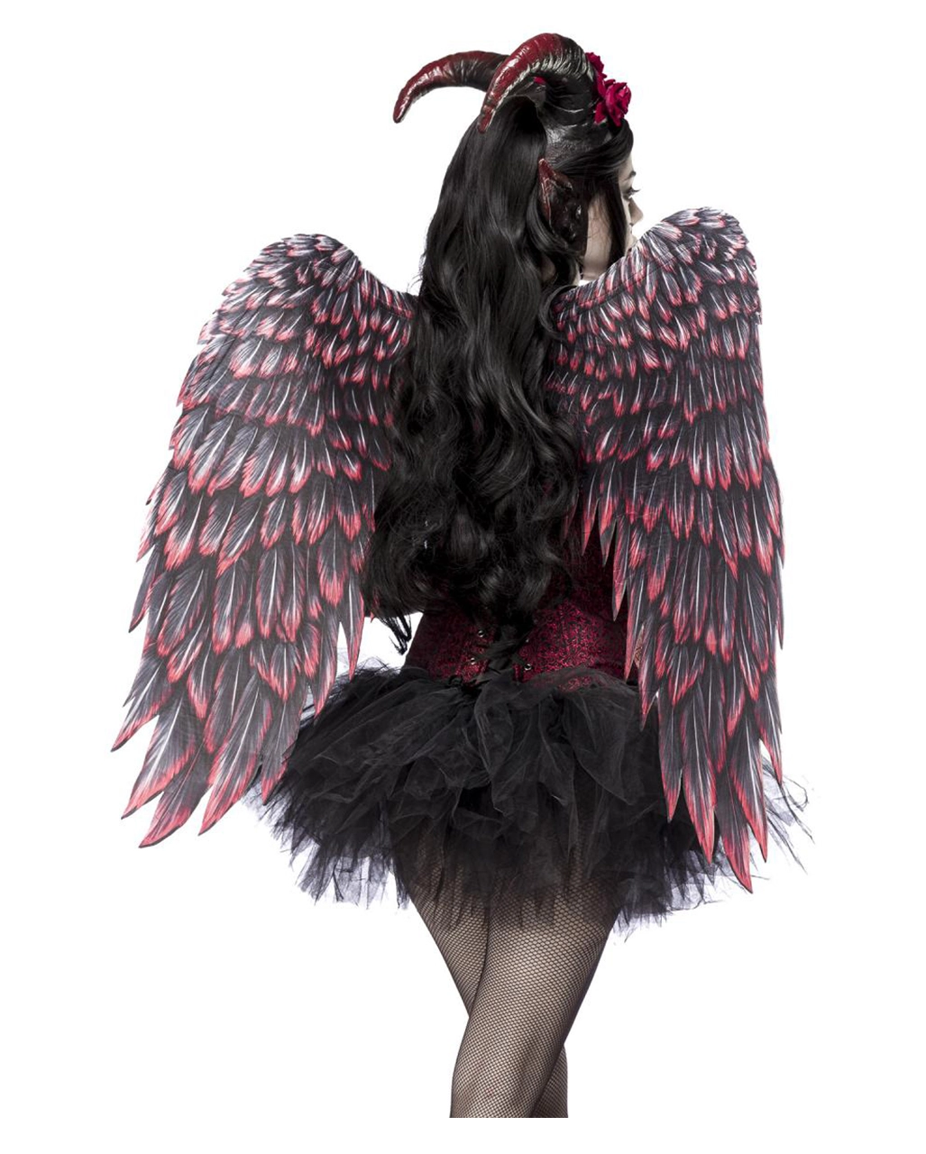 Das teuflische Gothic Kostüm mit mehrlagigem, schwarzen Tutu ist mit roten Rosen besetzt und verfügt über ein Gummibündchen. Eine sexy Corsage mit filigranem Muster besitzt Rüschen-Blumen am Ausschnitt und eine dekorative Borte. Verschlossen wird die Corsage mit Haken und Ösenverschluss praktischerweise auf der Vorderseite, während auf der Rückseite eine klassische Schnürung für den richtigen Sitz sorgt. An der Hörnermaske sind neben den mit Rosen verzierten Teufelshörnern auch die spitzen Teufelsohren befestigt, diese ist zum Binden. Zum krönenden Abschluss sind im Lieferumfang noch “All-Over” bedruckte, faltbare Flügel mit eingearbeitetem Draht enthalten. Diese sind mit Trägern aus Gummiband wie ein Schulranzen zu tragen.