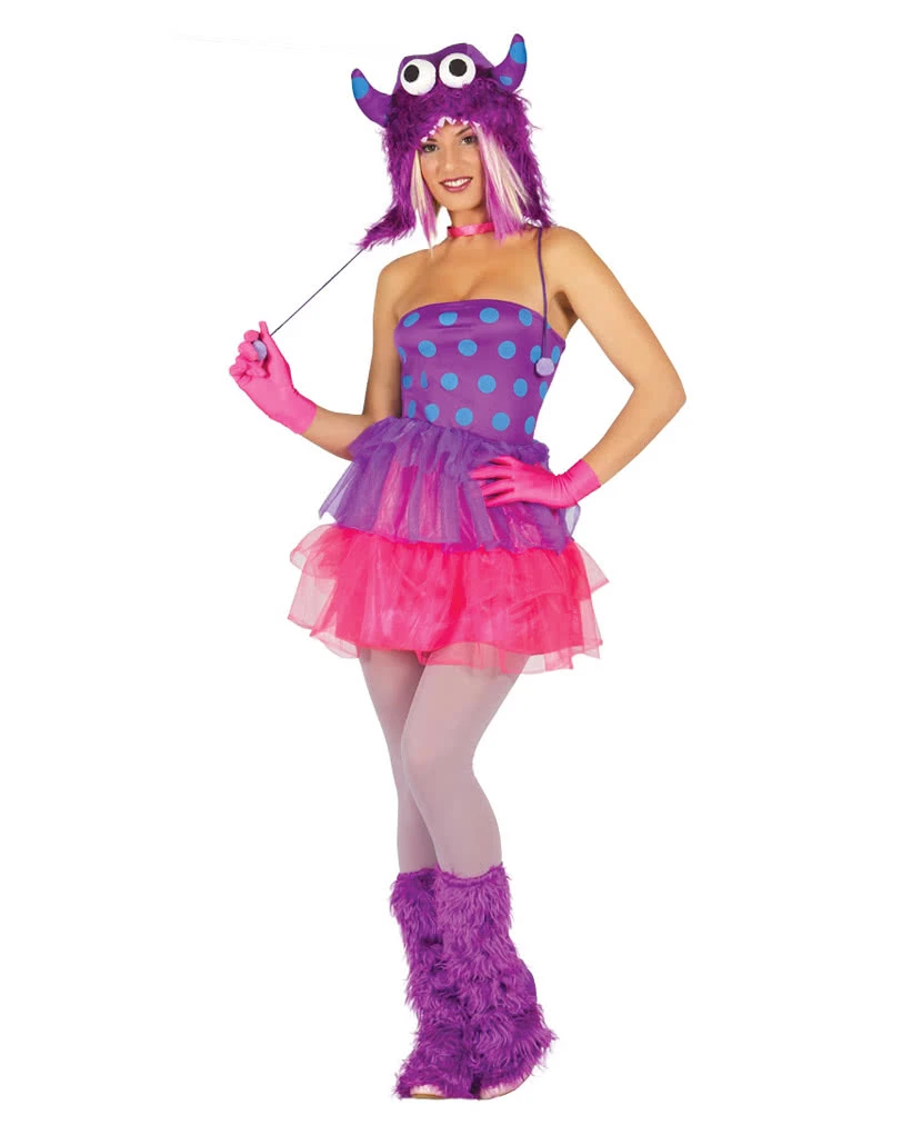 Das Sexy Fell-Monster Kostüm besteht aus einem lilanen trägerlosen Kleid mit blauen Punkten. Der Rock besteht aus zwei Tüllschichten in den Farben lila und pink. Das Kleid kann auf der Rückseite mt zwei Bändern an die Körperform angepasst werden. Die vollständige Verwandlung in ein sexy Monster erfolgt durch die mitgelieferten lilanen Plüschgamaschen und die plüschige lila Monsterhaube. Die Haube kann unter dem Kinn mit zwei Bändern festgemacht werden. Auf der Haube sind zwei lilane Hörner mit blauen Punkten sowie zwei Monsteraugen aufgenäht. Vorne hat die Haube noch angedeutete weiße Zähne, sodass es bei aufgezogener Haube so aussieht als ob der Kopf im Monstermaul steckt. Unsere Netzstrumpfhose weiß und die Fingerlose Handschuhe in Netzstruktur Neonpink runden dein Kostüm perfekt ab.