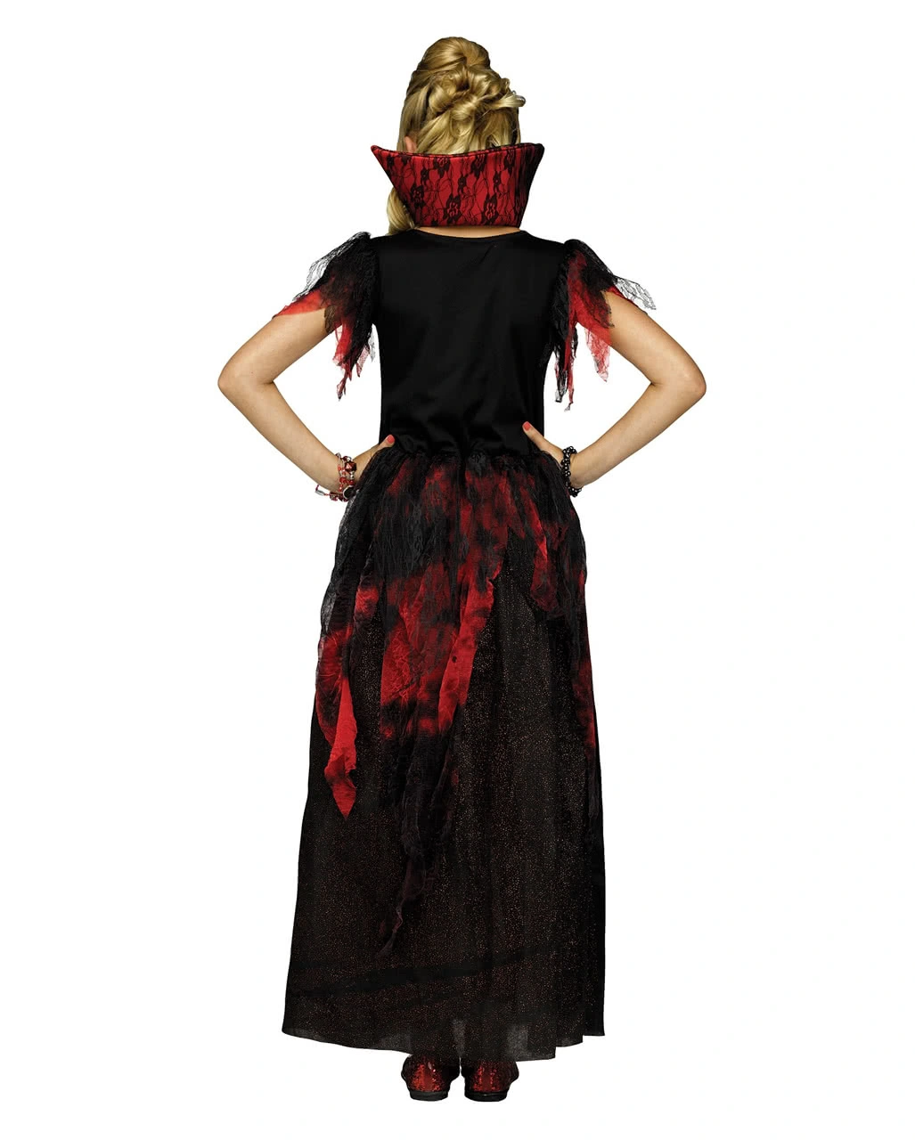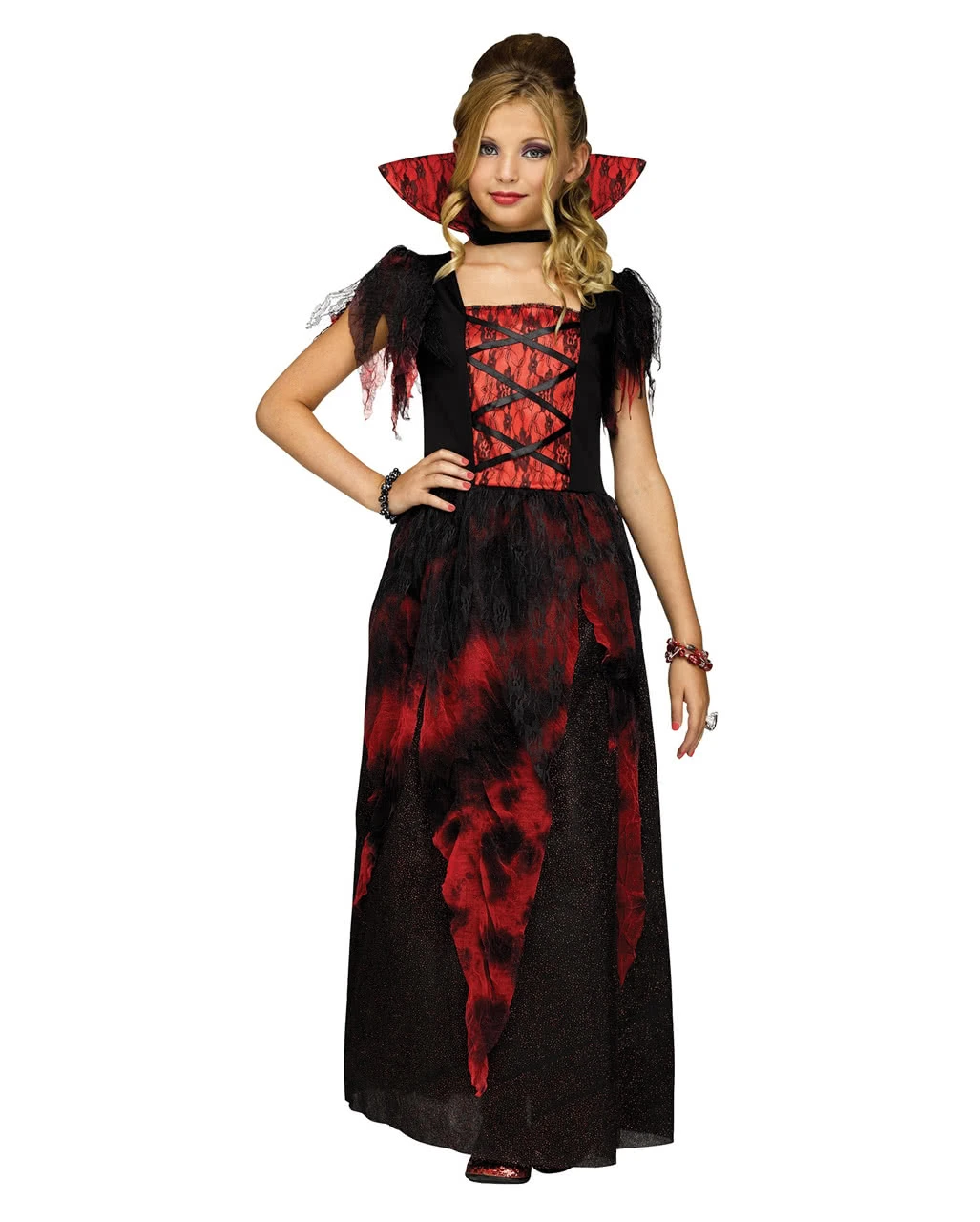 Das Vampir Gräfin Kinderkostüm besticht durch seine schöne Optik. Das Kleid der Halloween-Verkleidung mit seinen düsteren Rot- und Schwarztönen unterstreicht die gefährliche Aura hungriger Vampirdamen. Stilisierte Fetzen an den Ärmeln sorgen zusätzlich für eine finstere Optik als fliegende Blutsaugerin. Die angedeutete Schnürung verleiht dem Halloween-Kleid eine Gothic-Optik und sorgt für einen taillierten Schnitt. Zahllose rote Pailletten schmücken deine Fledermaus-Verkleidung zusätzlich und funkeln bei Lichteinfall. Abgerundet wird die Vampir-Verkleidung durch einen charakteristischen, per Klettstreifen einfach abzunehmenden, Stehkragen. Dazu passen ein Eckiger Ring mit rubinrotem Schmuckstein und das Blutsauger Make-up Set.
