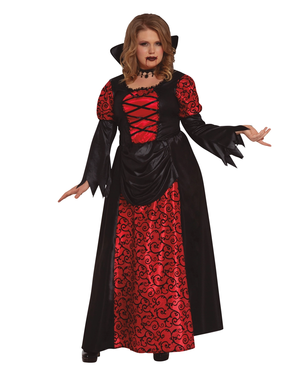 Das außergewöhnliche Kleid ist mit vielen besonderen Details ausgestattet und damit der absolute Hingucker auf jeder Party. Kräftiges Rot in Kombination mit tief glänzendem Schwarz, ein tolles Muster auf dem Rock, die feinen Spitzen an den Ärmeln und natürlich der klassische Stehkragen machen dieses Vampiressa Damenkostüm so extravagant und außergewöhnlich. Passend dazu kannst Du auch noch zu den stilechten Scarecrow Lady Fangs Vampir Eckzähne und zum Theaterblut Economy greifen.
