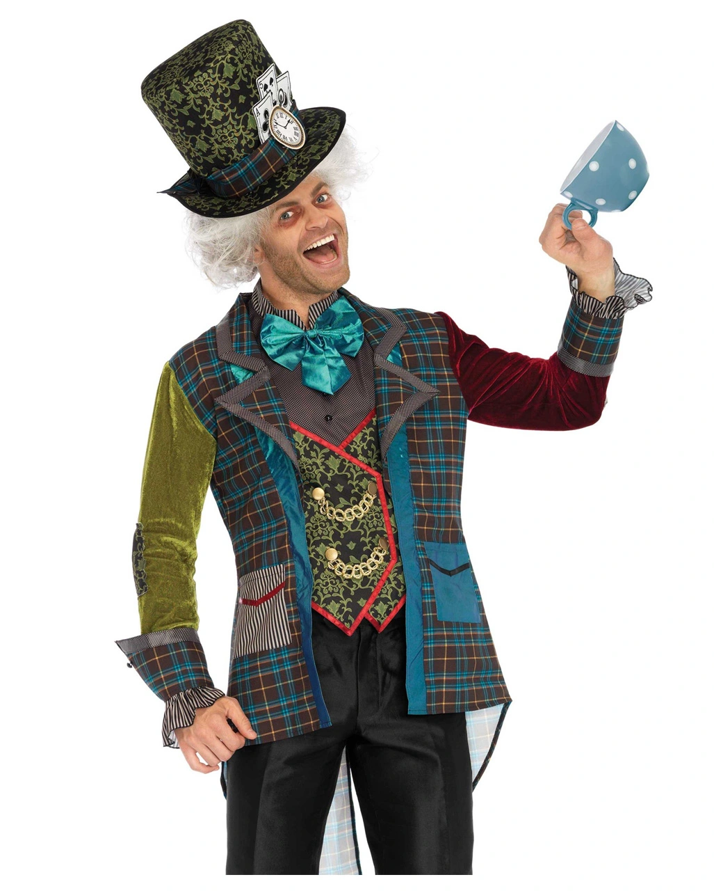 Du bekommst ein Verrückter Hutmacher Kostüm Deluxe bestehend aus einem mehrfarbigen Jacket in Flicken-Optik, einem türkisen Halstuch und einem hohen Hut. Überzeuge dich selbst von der hochwertigen Verarbeitung dieses Märchen Kostümzubehörs. Verschiedene Stoffarten und Texturen machen nicht nur optisch einiges her, sie fühlen sich auch fabelhaft auf der Haut an. Trage das Verrückter Hutmacher Kostümzubehör als Mix and Match Accessoire zu einer Hose und einem passenden Hemd aus unserem Onlineshop. Für Damen empfehlen wir unser Mad Hatter Damenkostüm