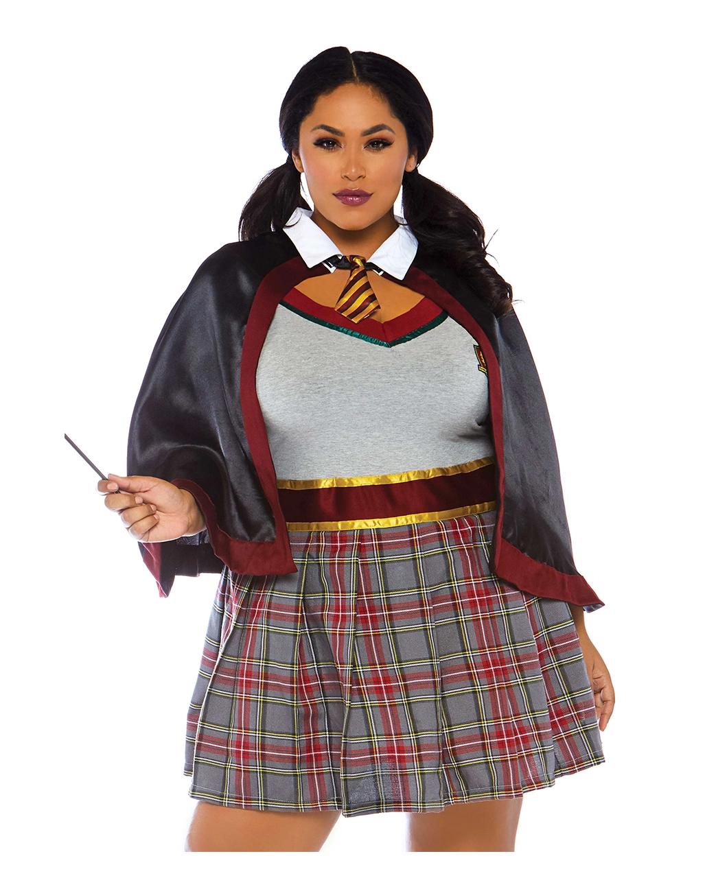 Kurvig und frech, das macht deinen Charme aus, der mit dem Zauberschülerin Damenkostüm die passende Verkleidung findet. Das kurze Kostümkleid des Plus Size Halloween Outfits besticht durch den knappen karierten Rock, der in ein weißes Oberteil übergeht. Goldene Ziernähte und der klassische Schulmädchenkragen am rot-schwarzen Cape machen dich zum weiblichen Zauberlehrling. Die neckische Krawatte rundet das XXL Kostüm ab. Wenn du jetzt deinen Zauberstab Hermine Granger schwingst, gehört die Motto Party dir allein!
