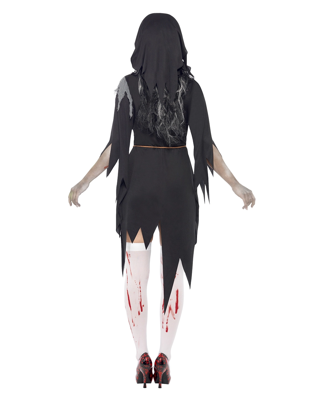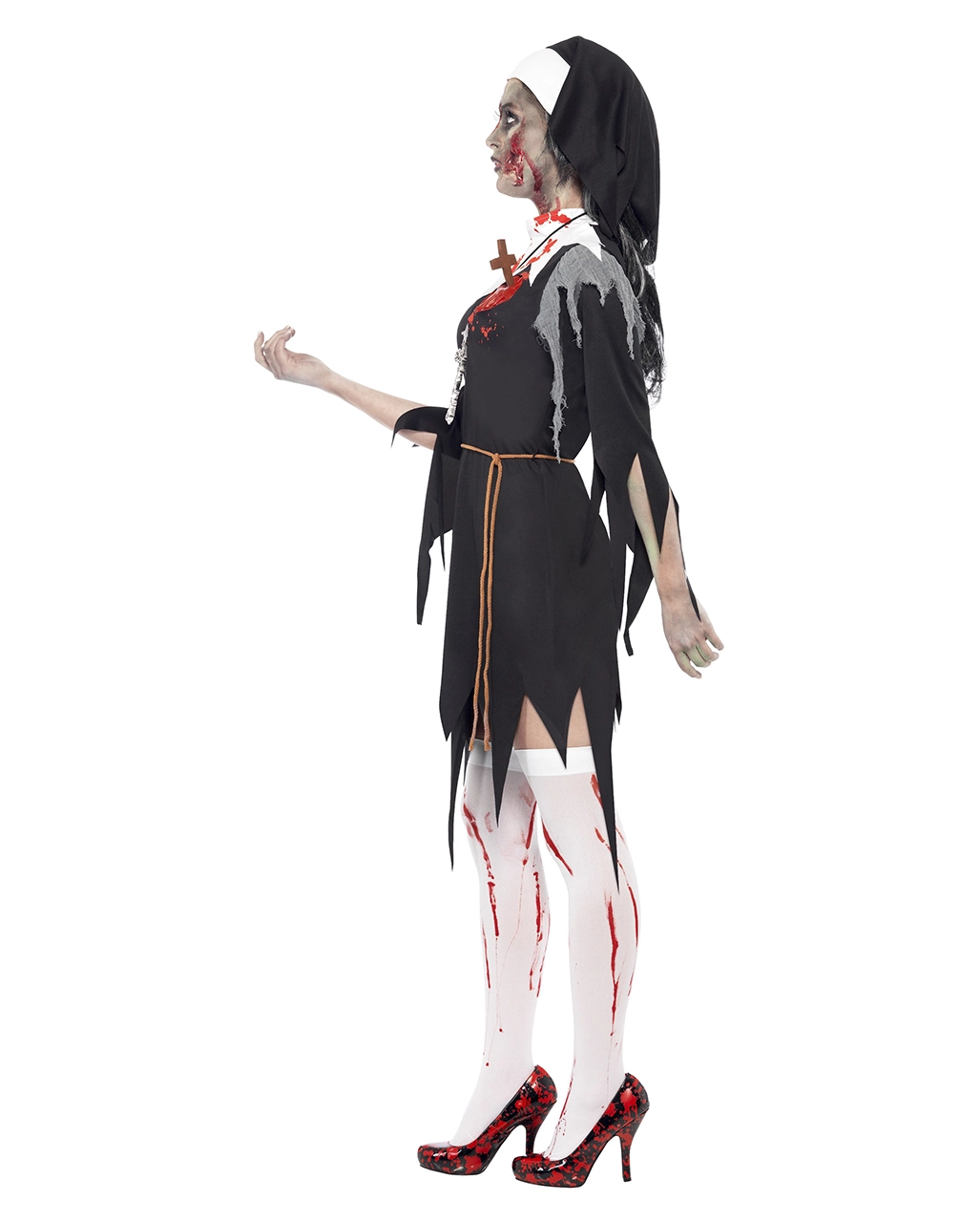 Das Nonnen Zombie Kostüm besteht aus dem Habit, dem Schleier und einem Gürtel. Die schwarze Nonnentracht ist auf Kniehöhe zackig abgerissen, die Ärmel sind ebenfalls unten zerfetzt. Am zerrissenen weißen Kragen sind riesige Blutflecken. Über dem Herz ragt ein hölzern wirkendes Kreuz aus einer Blutlache aus Latex hervor. Der Gürtel besteht aus einer geflochtenen Kordel. Ein paar Blutige Overknee Strümpfe, die Pumps mit Blutspritzern und das Zombie Make-up Kit Deluxe 8-teilig lassen die Zombie Nonne noch gruseliger aussehen.